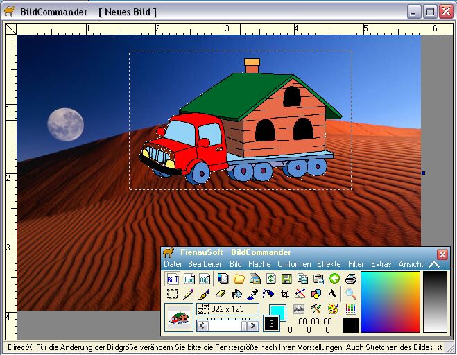 Mit dem BildCommander können Sie ein Bild in ein anderes Bild mit ausgeblendeten Hintergrund einfügen. Laden Sie sich zuerst das Große Bild in den BildBommander. Anschließend öffnen Sie eine zweite Arbeitsfläche mit dem Befehl Datei | Neu | Neue Arbeitsfläche oder das Icon Neu in der Symbolleiste. Jetzt laden Sie dort das Bild, welches Sie komplett oder ein Teil daraus (Objekt) in das erste Bild einfügen möchten. Mit dem Befehl Objekt ausschneiden können Sie nun das Objekt (Person, Auto, Gegenstand...) ausschneiden. Setzen Sie den Cursor (Fadenkreuz) unten in der Mitte und klicken. Setzen Sie nun den Cursor rechts davon, wenn Sie im Uhrzeigersinn weitermachen, und klicken Sie an der nächsten Unebenheit. Werter bis Sie das Objekt umrundet haben. Der letzte Klick bitte auf die Ausgangsposition. Nun kopieren Sie das Objekt mit dunkelblauer Ausblendfarbe und gehen zurück zur ersten Arbeitsfläche (Menu | Fläche). Nun das Objekt einfügen (Auf der erscheinenden Farbpalette die Ausblendfarbe ausschuchen). Anschließend können Sie das Bild in der Grafik hin und herbewegen, wie Sie möchten. Klicken Sie neben das Bild, wird es in der Grafik verankert.